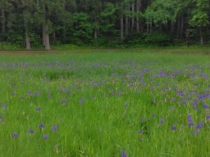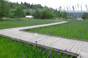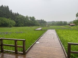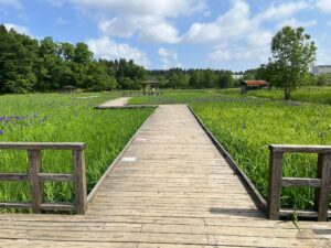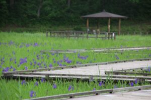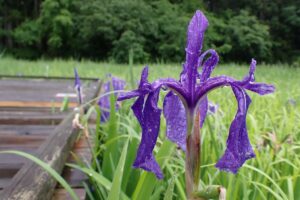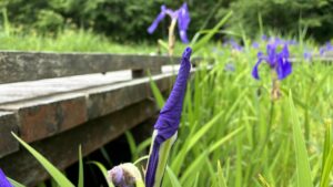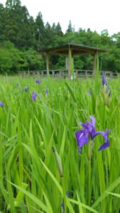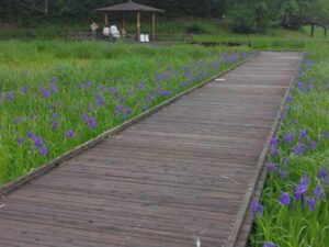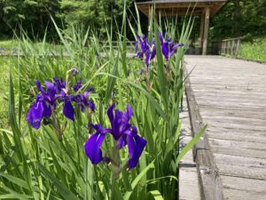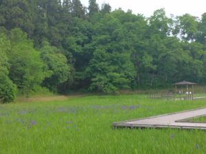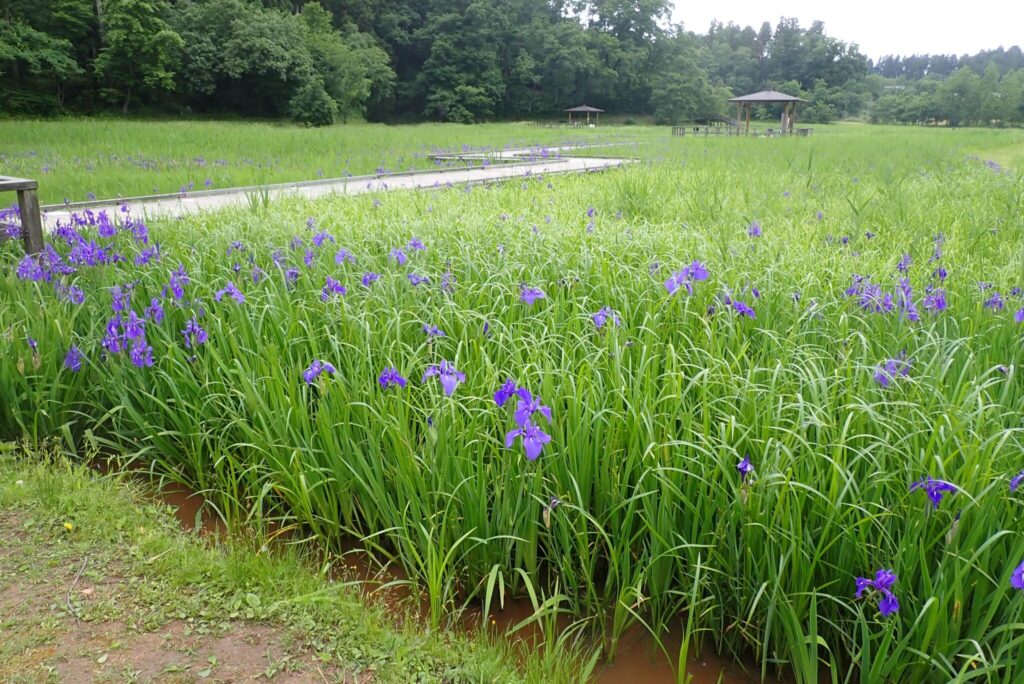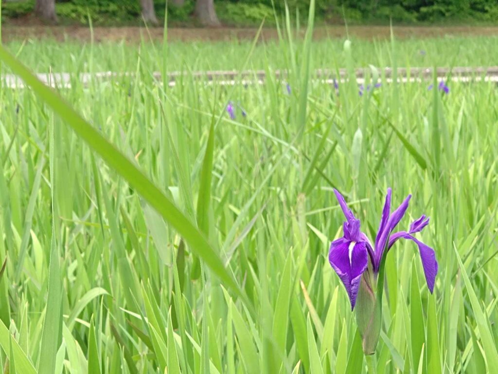 カキツバタの水辺全体に紫色が広がってきています。水辺の木道には2つの東屋があるのですが、奥の東屋へ続く木道沿いがとてもきれいです。一番はじめに咲いたカキツバタは、三番目の最後の花が咲いています。
