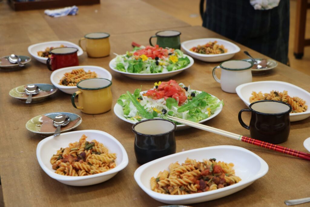 お昼は観察した野草を使ってパスタとサラダづくり。
