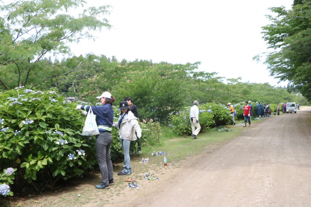 メイン園路にずらりと並ぶアジサイたちの剪定作業でした。