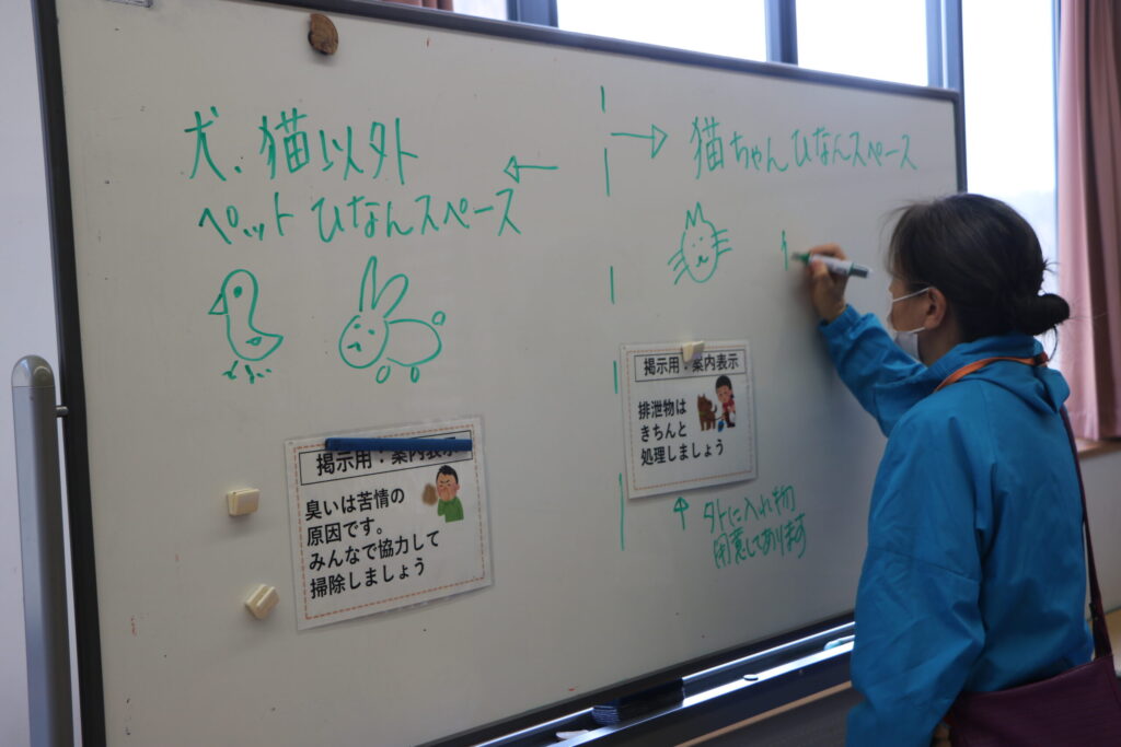 実際にわんちゃんを連れてきていただいた方やネコを飼っている方など、様々な方に参加してしただき、スターターキットを使用して避難所を開設をしていきました。