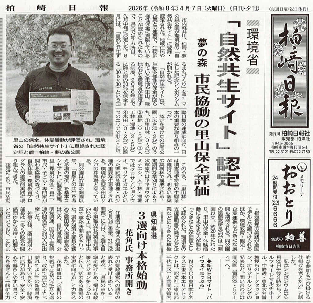 柏崎日報さんに、自然共生サイトの登録について取材していただきました。