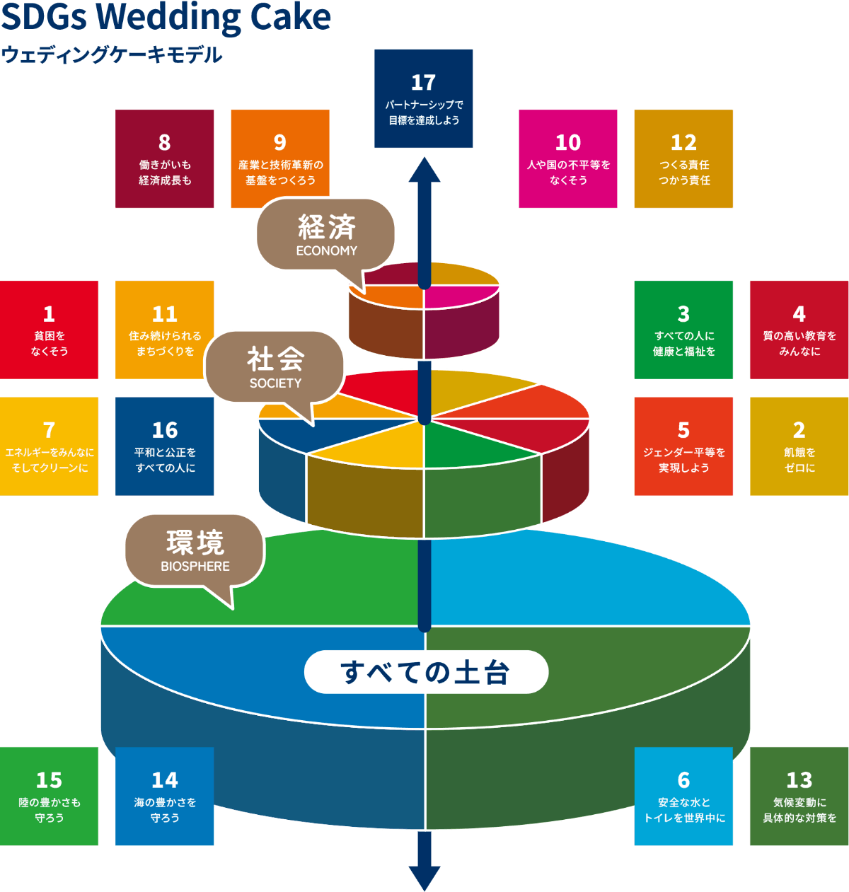 SDGs(持続可能な開発目標)は、2015年に国連が採択された2030年までの共通目標です。環境・人権・経済の3つの視点で、地球規模の課題を解決するための枠組みです。これらの課題はすべて、人間の活動によって引き起こされており、未来を守るには3つの要素を調和させて行動することが求められています。