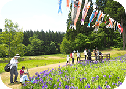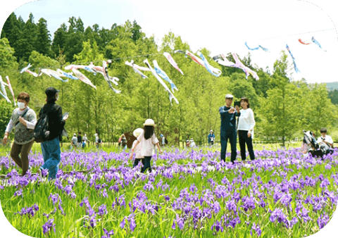 柏崎ライオンズクラブの協力で、市内に眠っていたこいのぼりを再活用。2010年から始まり、2021年からはかきつばた苑の上空を泳ぐようになりました。青空と紫の花のコントラストが、多くの来園者を楽しませています。