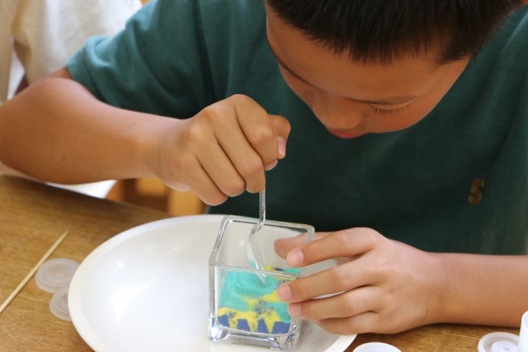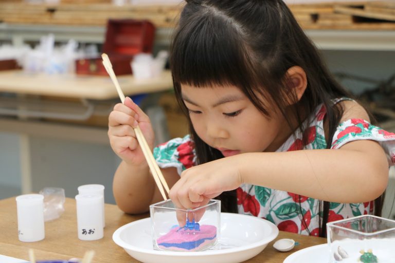 砂の中から貝殻をすくって探し、その貝やカラーサンド、ガラス細工をグラスに配置してジェルキャンドルを作っていきます。※難しい工程が多いため年齢が低いお子様の場合、保護者の方が作るような形になることがあります。ご承知ください。