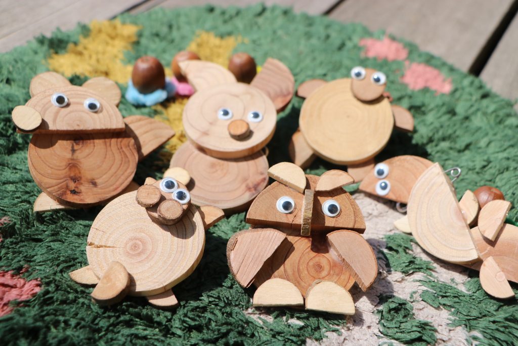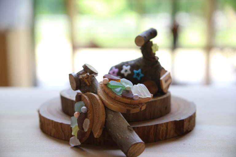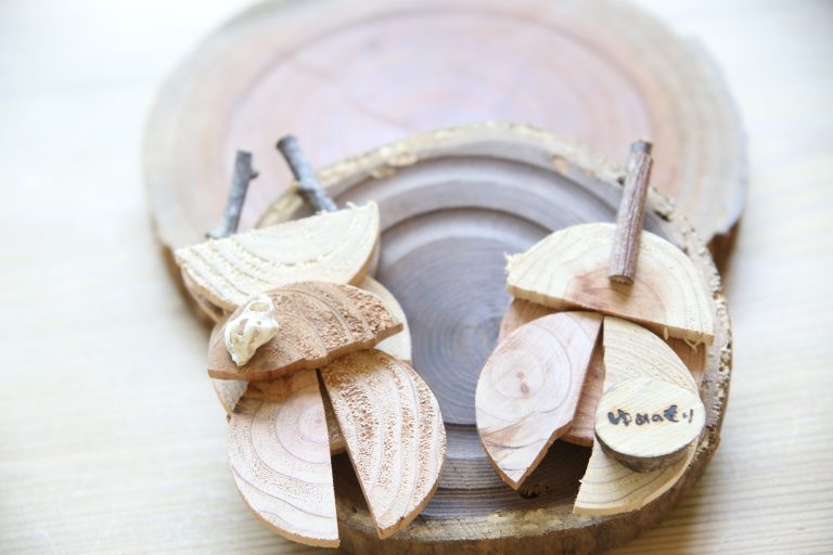 柏崎の海岸から持ってきた流木や夢の森の木の枝や木の実、県内産の木のパーツを選んで自由にクラフトをすることができます。のこぎりの貸出もあるので、自分の好きな大きさに切ることもできます。