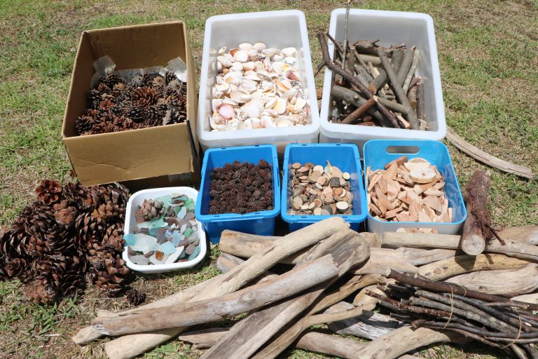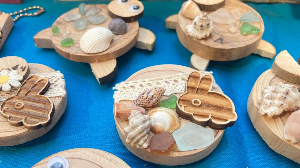 柏崎の海で採取した流木やシーグラス、夢の森公園の木の実や木のパーツなどさまざまな素材を取り揃えています。その中から好きな素材を選びボンドでくっつけていき、置物やガーランドなどを自由に作っていきます。