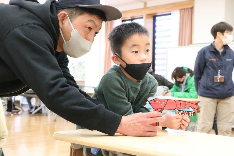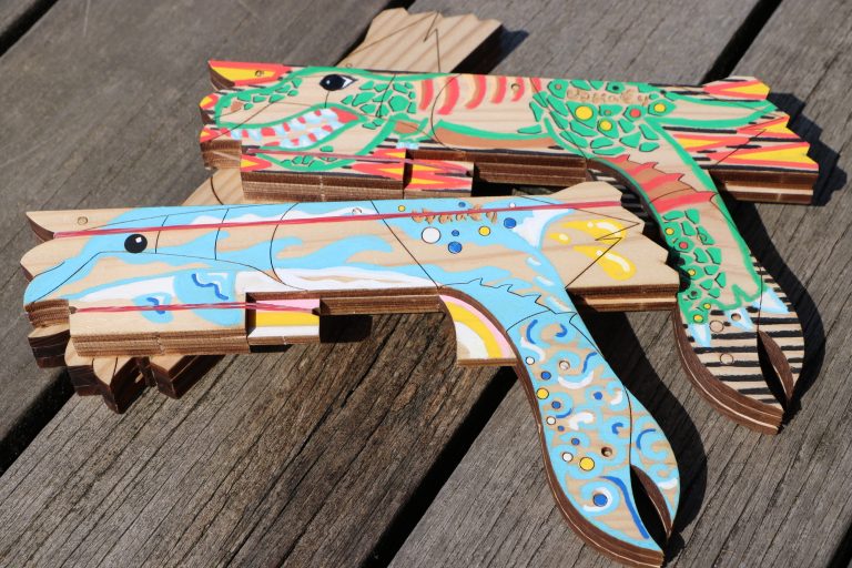 ザリガニがモチーフになった鉄砲を型から抜き、やすり掛けや色付けを行い仕上げていきます。イルカなどザリガニの絵でないものを書いても大丈夫です。