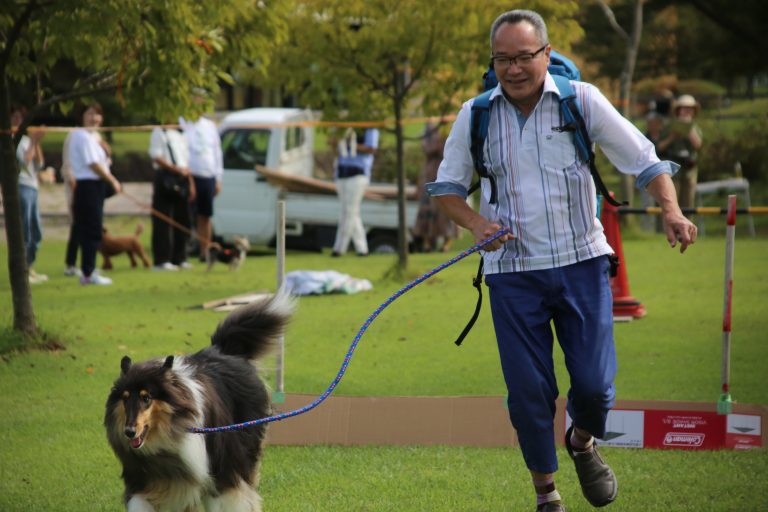 わんちゃんのリードを離して速さを競うような競技ではなく、リードは付けたまま飼い主さんと一緒に走るリレーとなります。また、大型犬、小型犬などのサイズ別の競技でもありません。