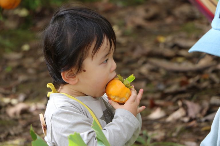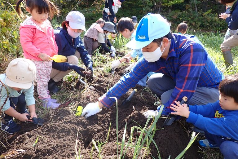 ★ピクニックシートでお弁当、菜の花の種まきや芋ほり・柿もぎ(秋)、どんぐり探しやクラフト、豚汁づくり、冬はそり遊びなどの季節の遊びが楽しめます。