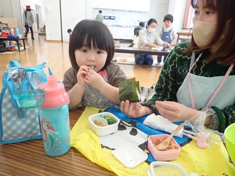 夢の森公園産コシヒカリでおにぎりづくりやお野菜を切って具だくさんのきのこ味噌汁づくりなど、ちょっとしたお料理にもチャレンジ。お弁当をみんなで食べましょう!