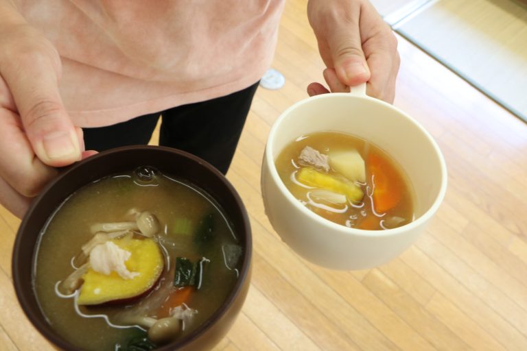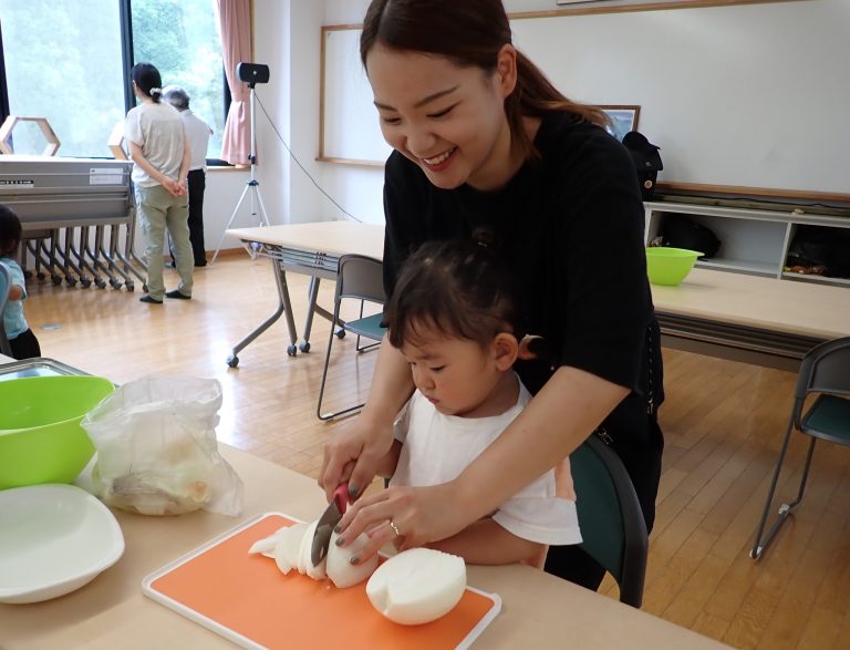 夢の森公園の味噌を使って味噌汁づくり。親子で一緒に野菜を切ったり皮をむいたりします。