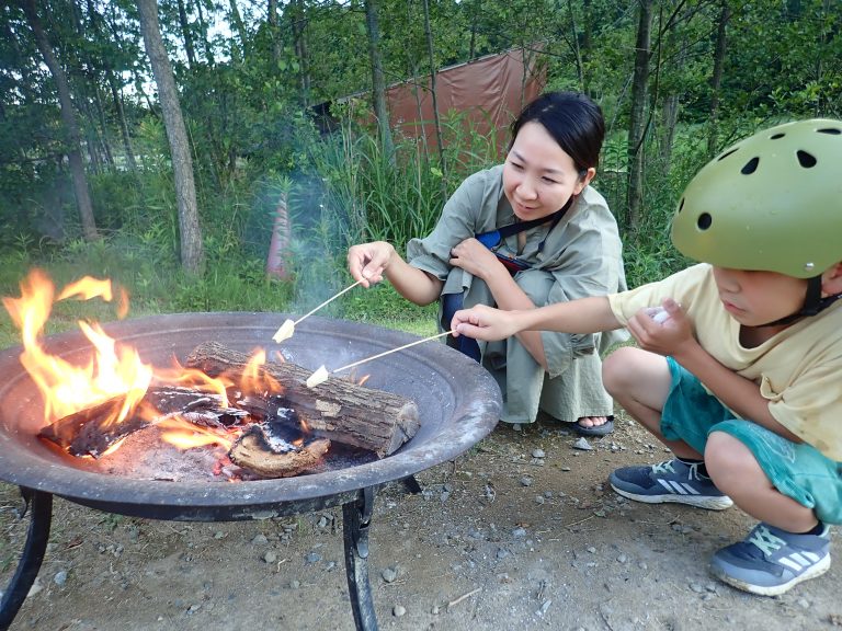 🍙もちもの:懐中電灯(家族に1本あればOK)、おにぎりの具、のみもの、おかず(のり・ご飯は夢の森で用意しています)、 マシュマロやチーズなどたき火で焼きたいもの(たき火体験は30分程度なので火が通っている簡単なものでお願いします。いもは火が通るまで30分はかかるので必ず茹でてからご持参ください。)