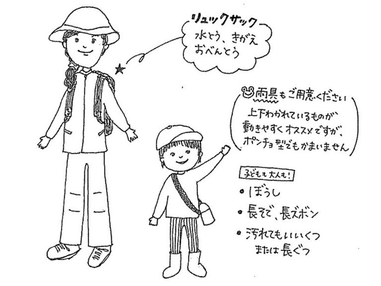 *上図は講座「ゆめの森のようちえん」の推奨服装ともちものです