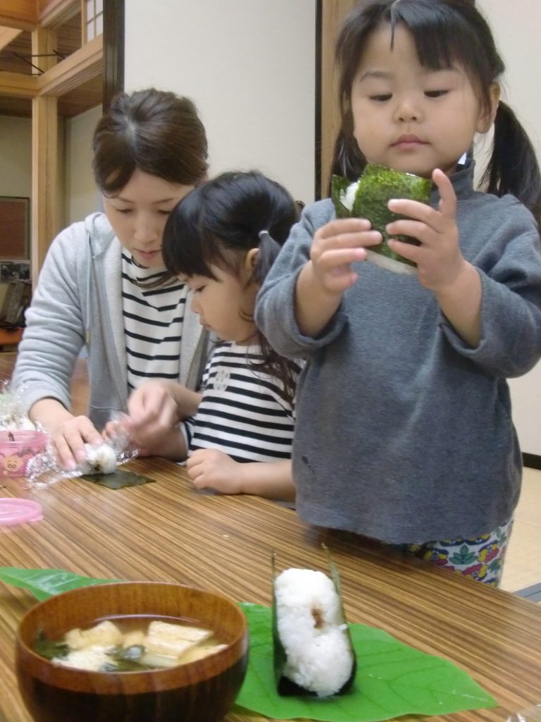 味噌づくりの後はおにぎりを作って食べます(味噌汁つき)