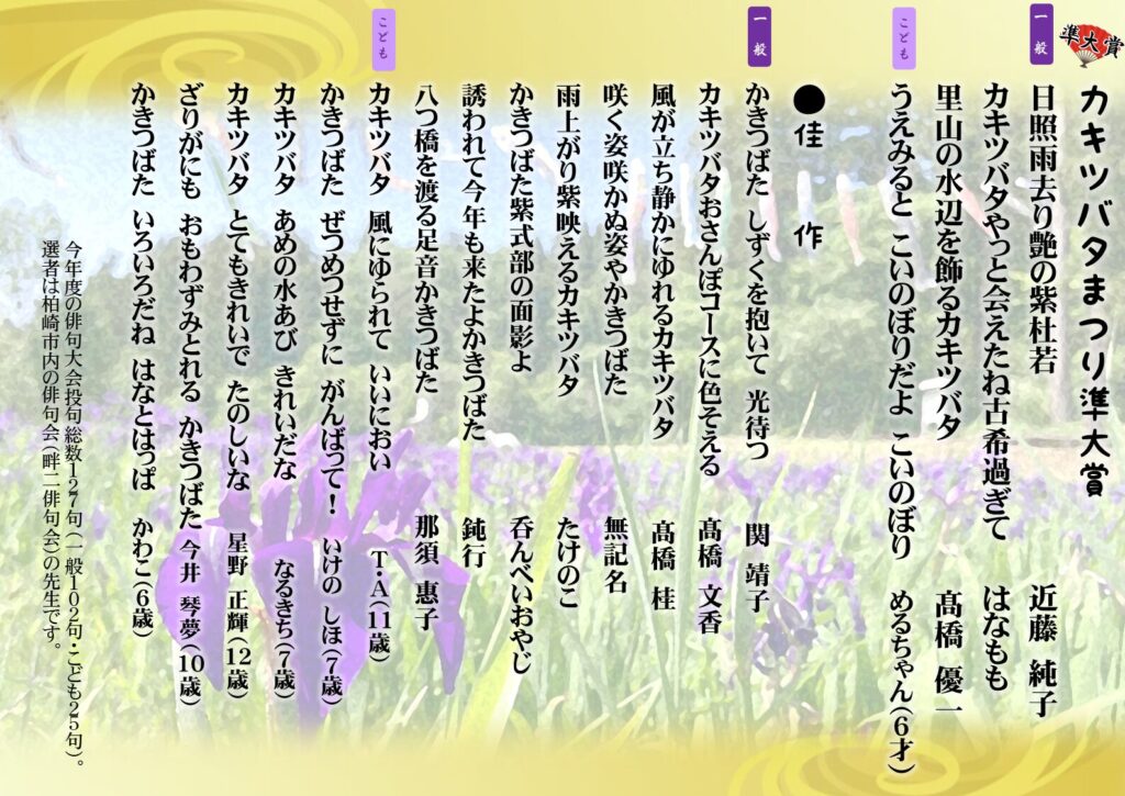 | プログラム名 | カキツバタ俳句大会2026(投句期間5/10~5/31) |